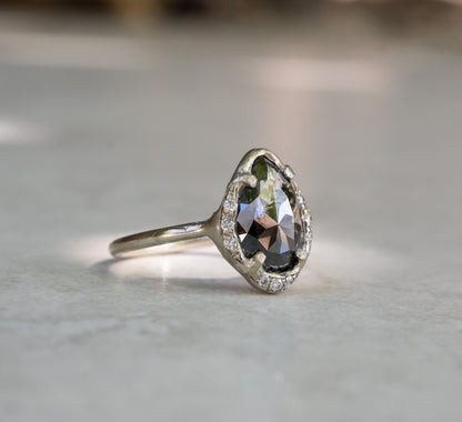 Stormy and translucent, 1.58ct salt and pepper pear diamond.  Set in a luxurious molten 14k white gold setting with a scattered hand-set diamond halo. Extraordinary matrix of smoky black inclusions.